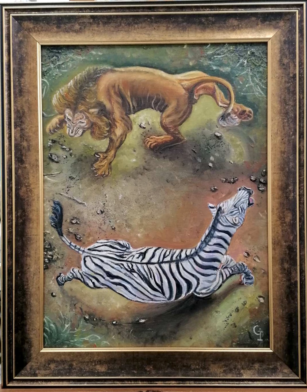 Survival’, part 1, oil/canvas 48/38 cm. “In the endless circle of animal life, death for some means life for others.” Nat Geo Wild.