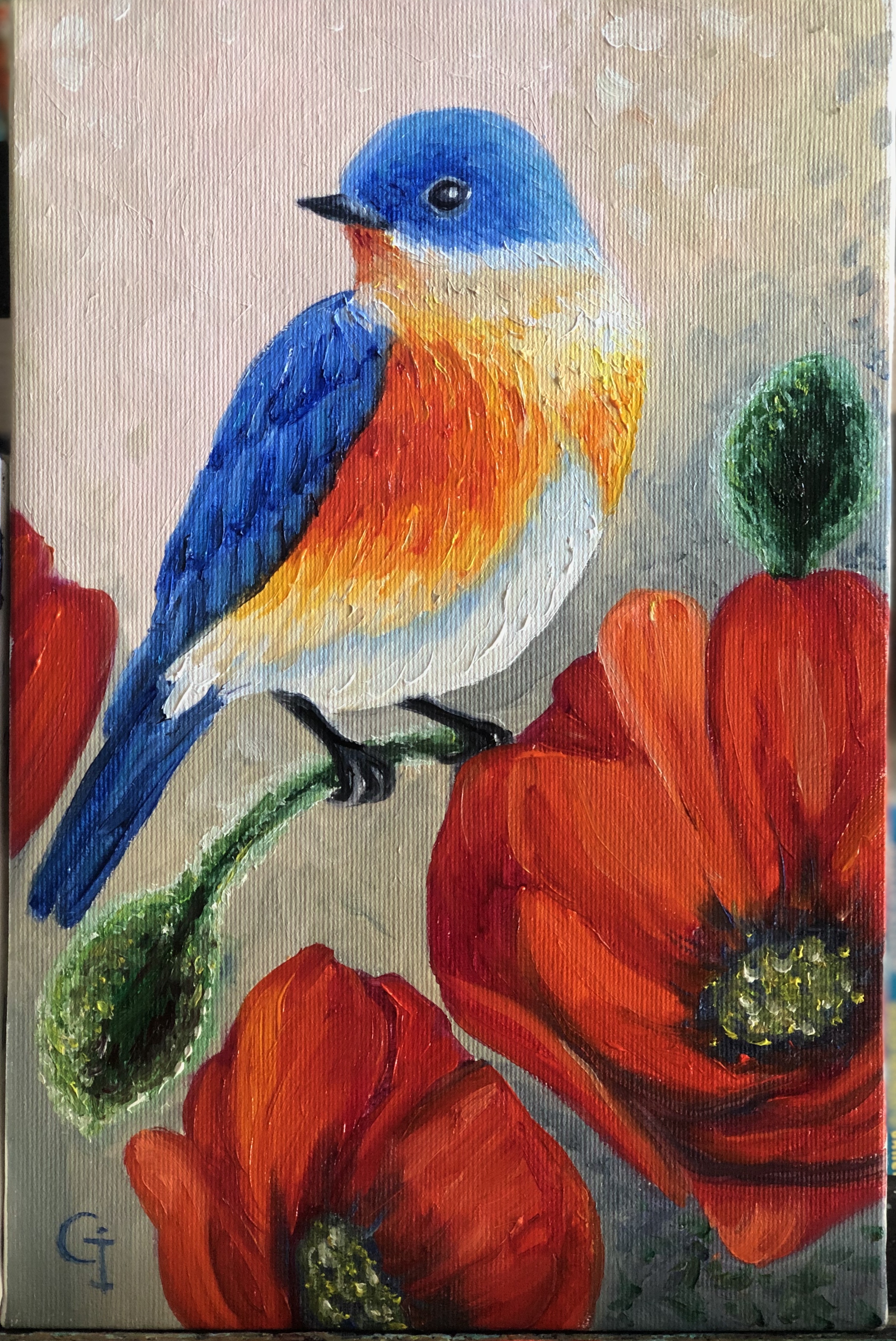 ’Bird and poppies’, oil/canvas 30/20 cm