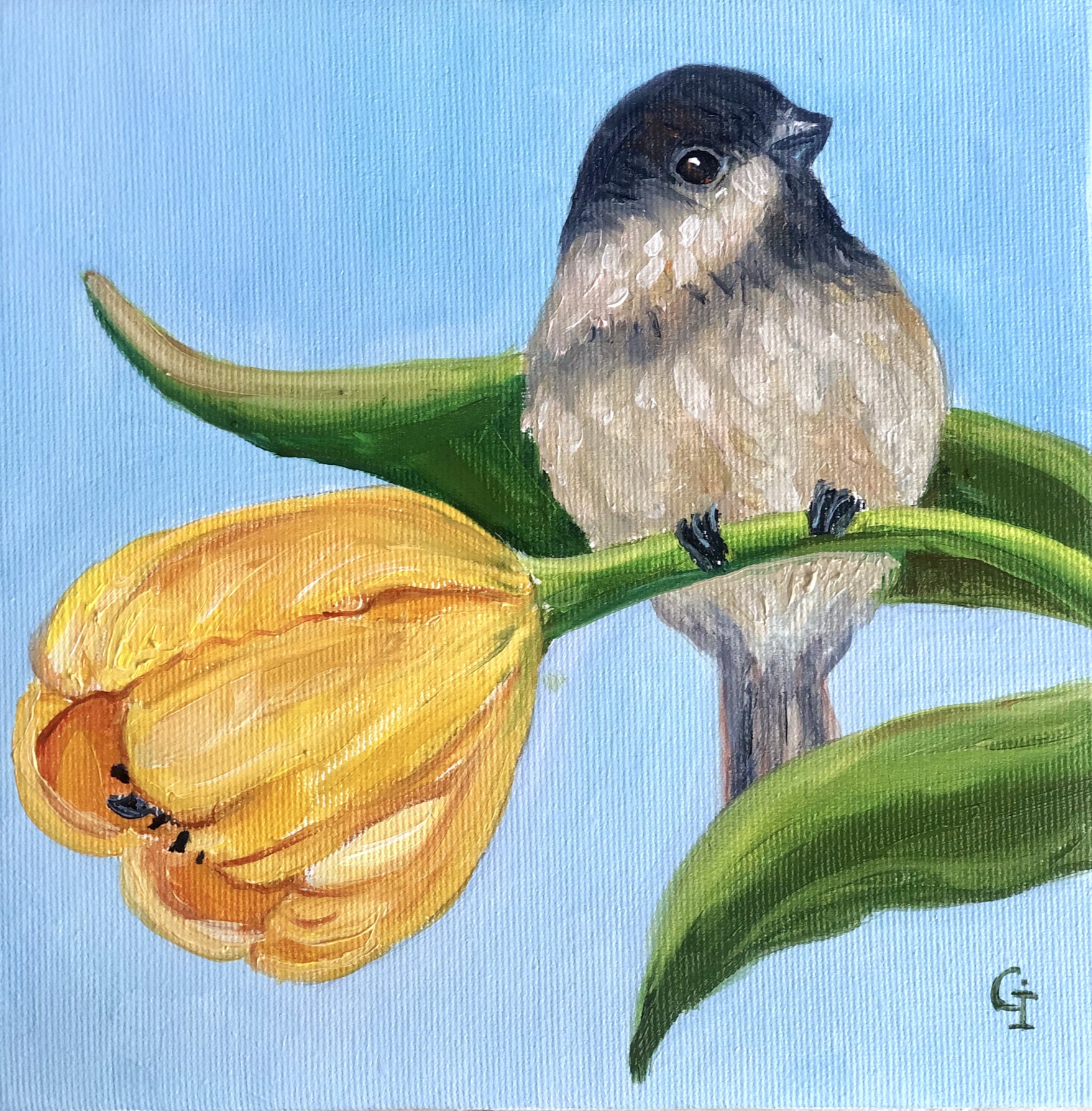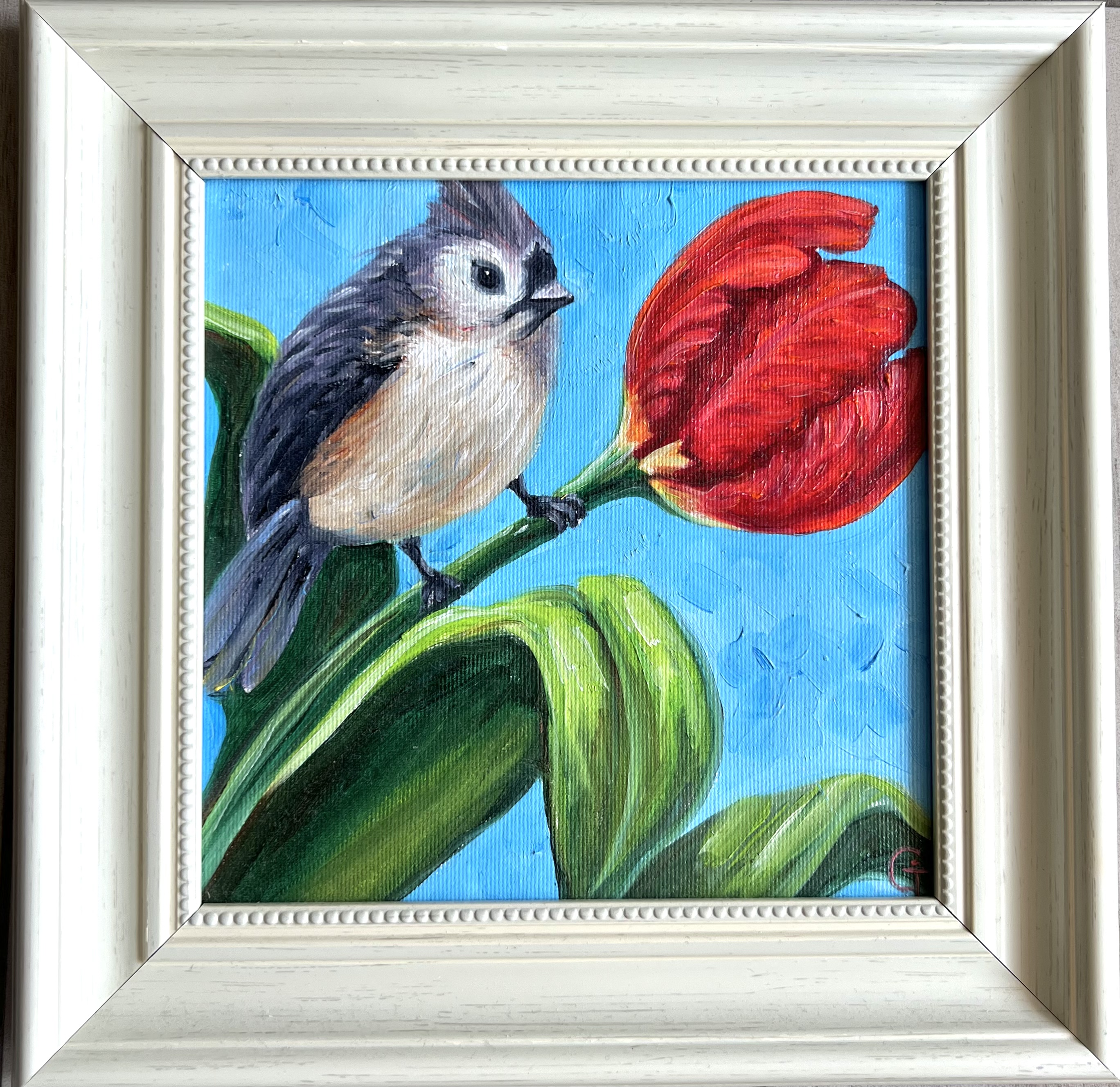 ‘Bird and tulip’, oil/canvas 25/25 cm
