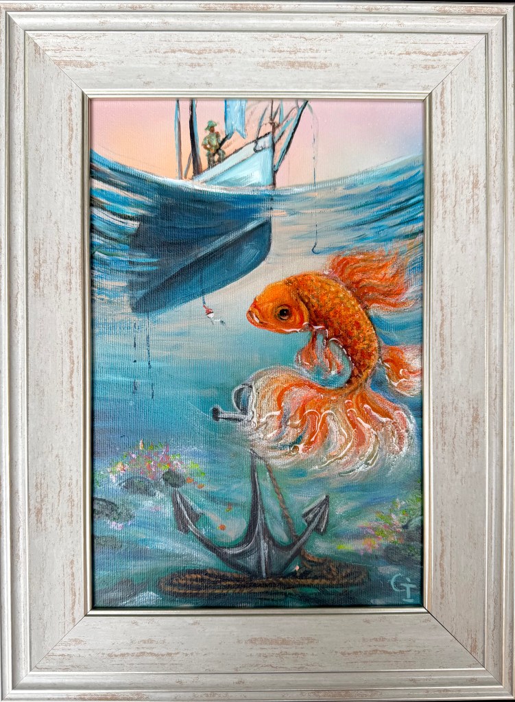 “Goldfish and the fisherman”, acryl on canvas 40/30 cm