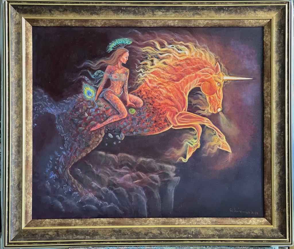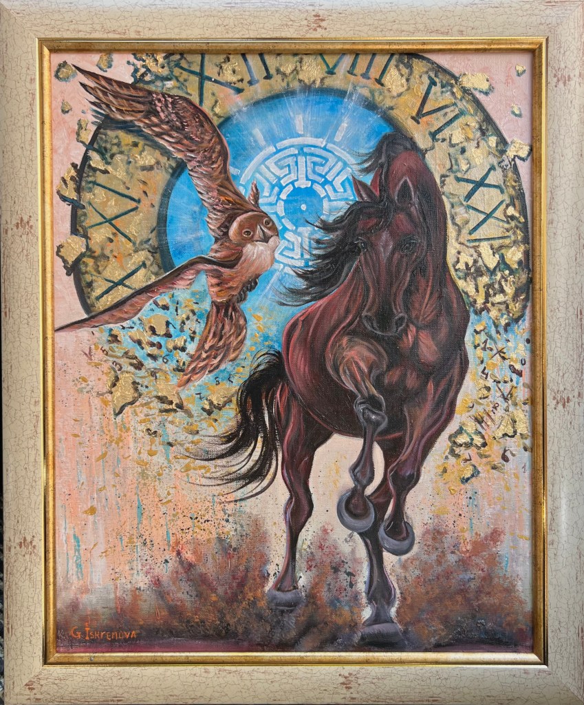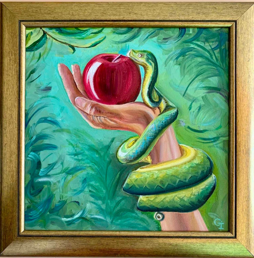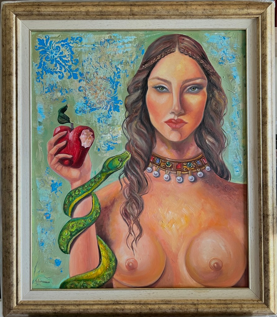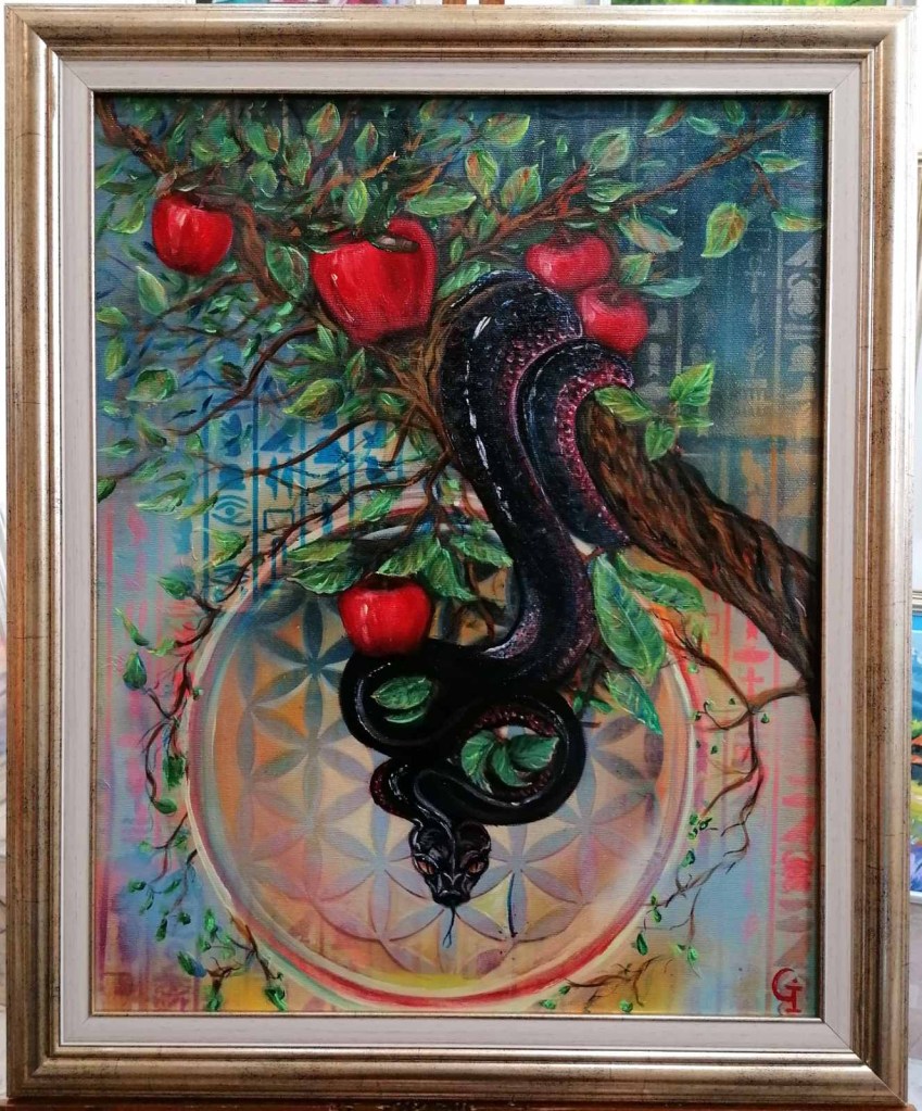 The painting is a portal between worlds — between matter and spirit, between ancient and contemporary wisdom. It invites the viewer to taste the fruit of knowledge, to follow the mystery of inner awakening, and to step into the circle of the sacred.