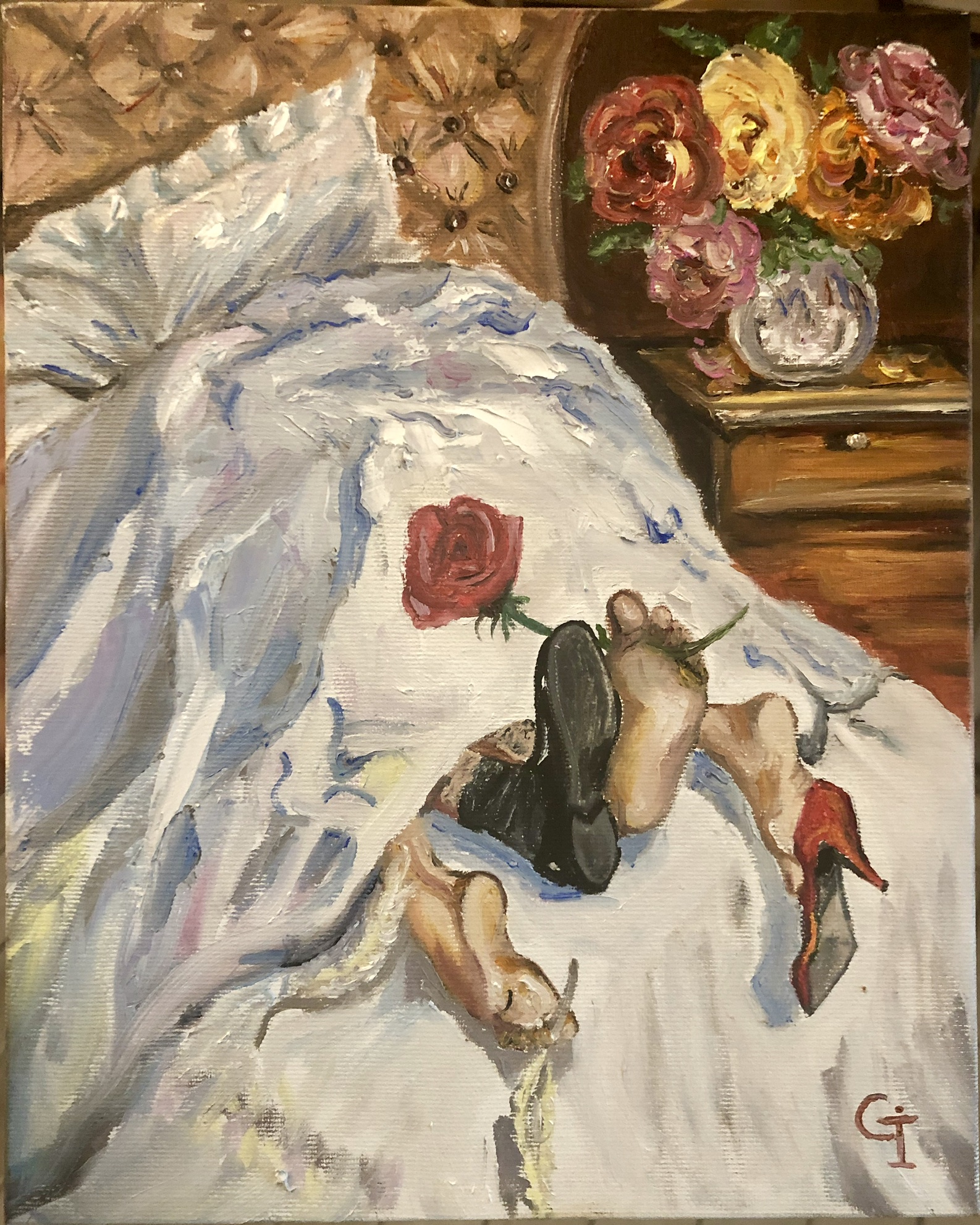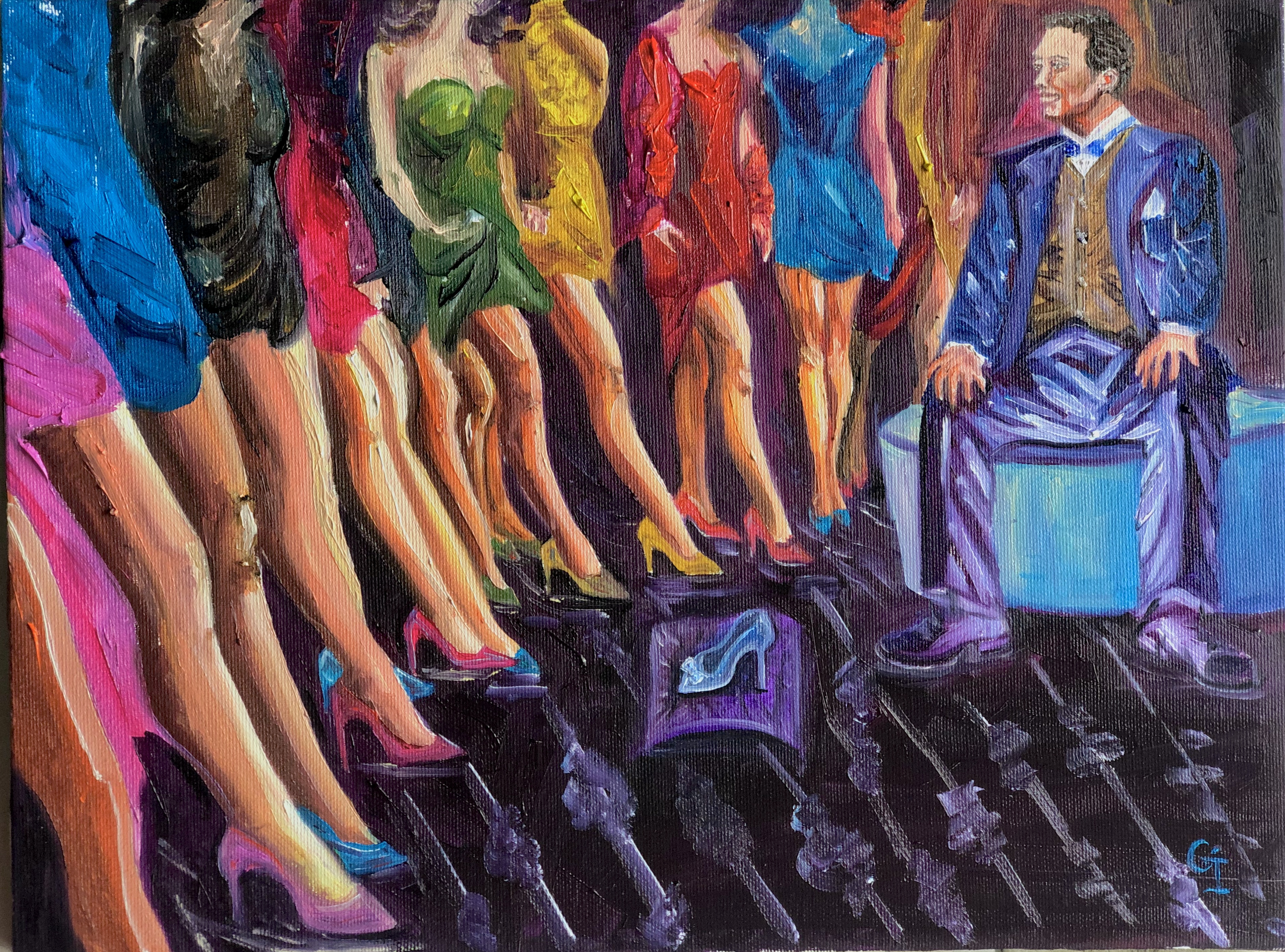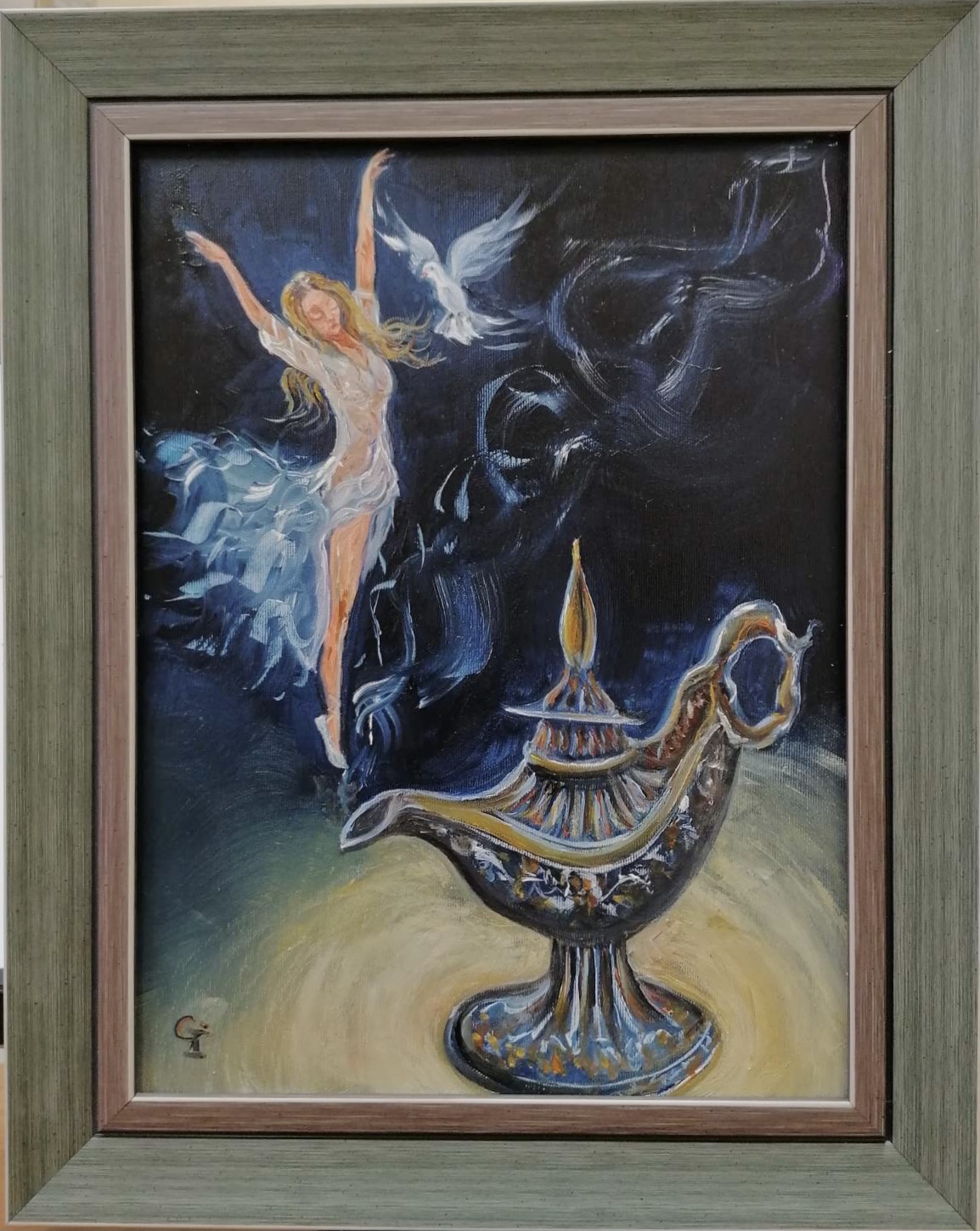 ‘Without Cinderella’ is a 40/30 cm oil on canvas painting. The second shoe is unconsciously the soulmate in Cinderella’s story, which is why its possessor is sought after and the only one among many. Romeo becomes Casanova as a result of his life without a soul mate.